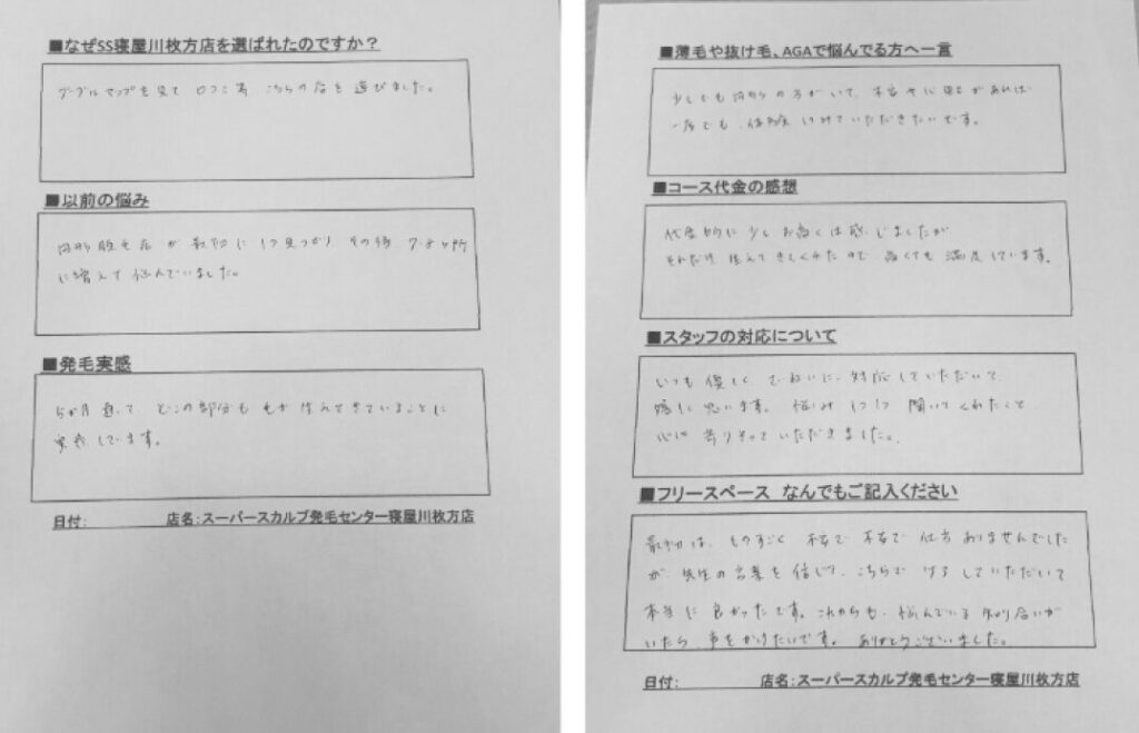 当店(スーパースカルプ発毛センター寝屋川枚方店)で実際に発毛されたお客様のリアルタイム発毛レポートです。