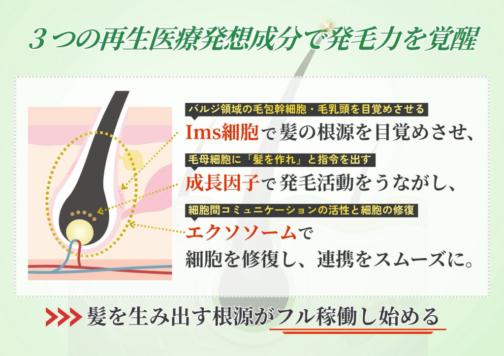 - アプローチ②「3つの再生医療発想成分(ImS細胞・成長因子・エクソソーム)」で発毛の根源を直接目覚めさせる