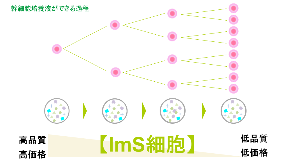 通常の幹細胞は分裂回数に限界がありますが、ImS細胞は世界特許によってテロメアをコントロールし老化を抑制する技術を用いることで、常に若々しい状態を保ちながら増殖できます。