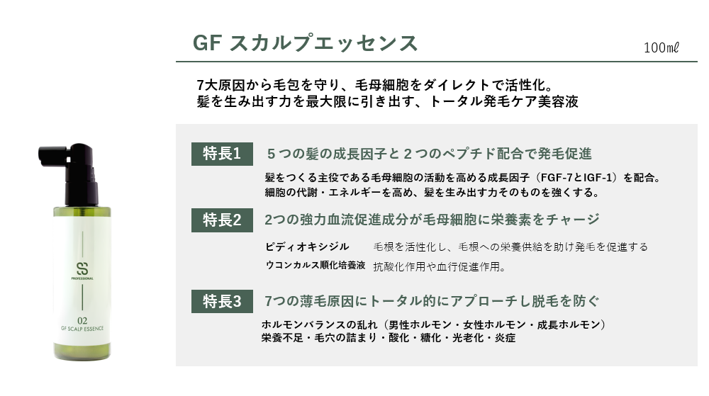 次に使用するのが、GFスカルプエッセンスです。名前の通り、成長因子(GF:グロースファクター)をたっぷりと配合した製品です。