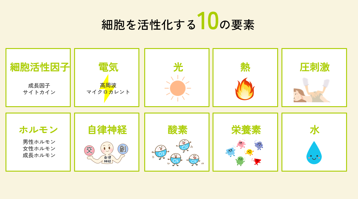 発毛を加速させるには、細胞そのものを活性化させることが重要です。科学的には、細胞の活性化には10の要素が関与していると言われています。