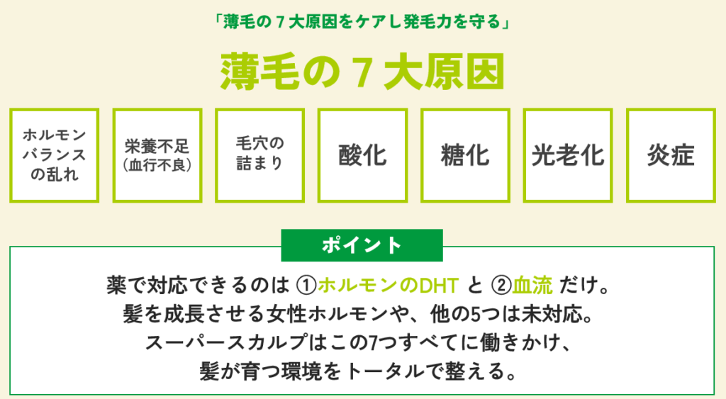 スーパースカルプの最初のアプローチは、薄毛を引き起こす7大原因を取り除き、発毛力が育つ土台を整えることです。