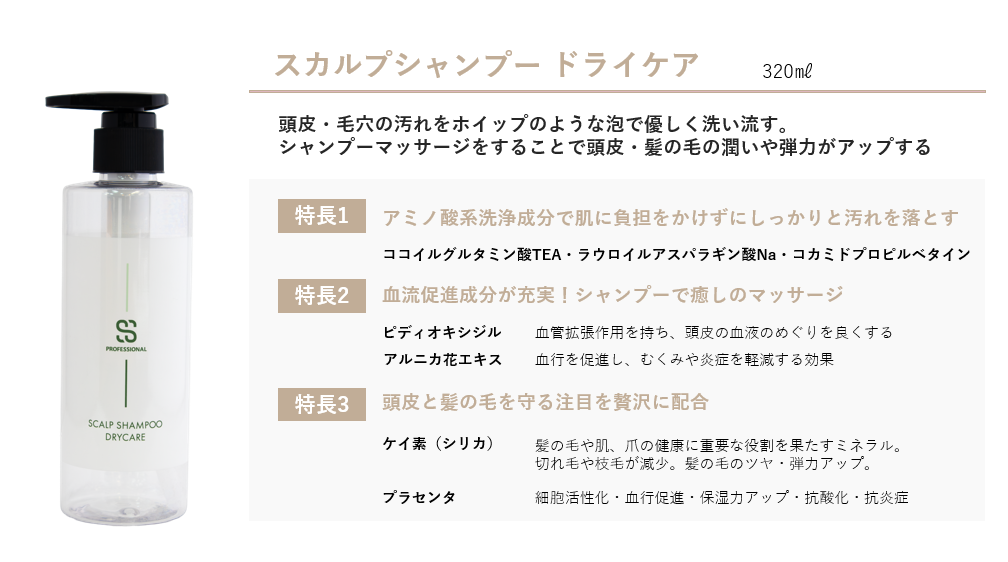 ラインナップはオイリーケア(脂性肌用)とドライケア(乾燥肌用)の2種類。どちらにも、血流促進効果が期待できるピディオキシジルとアルニカ花エキスが配合されており、シャンプーしながら頭皮の血行改善も同時に図れます。
