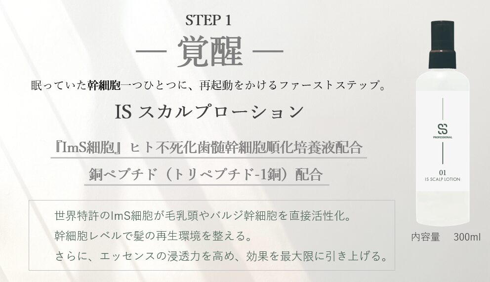 さらにISスカルプローションには銅ペプチドも配合されており、最初に塗布することで細胞に「目覚めのスイッチ」を入れる役割を果たします。