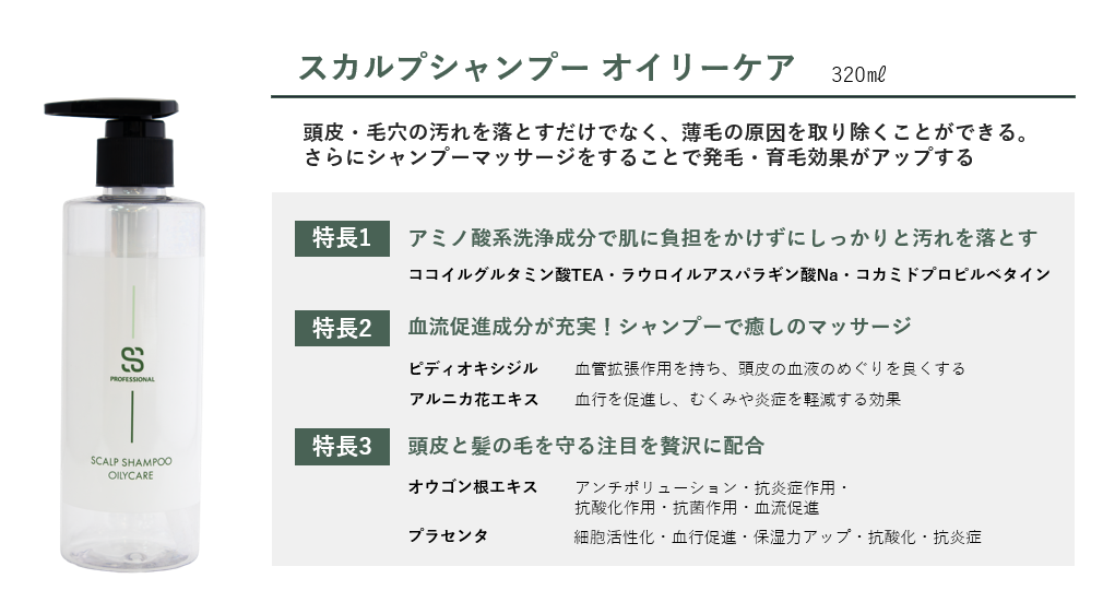 ラインナップはオイリーケア(脂性肌用)とドライケア(乾燥肌用)の2種類。どちらにも、血流促進効果が期待できるピディオキシジルとアルニカ花エキスが配合されており、シャンプーしながら頭皮の血行改善も同時に図れます。