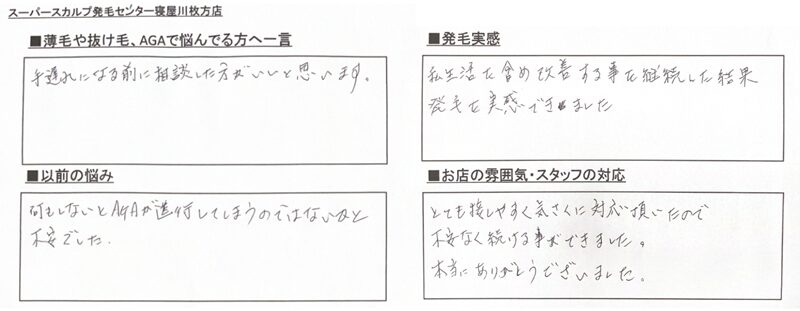 当店(スーパースカルプ発毛センター寝屋川枚方店)で実際に発毛されたお客様のリアルタイム発毛レポートです。